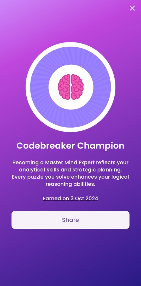 Win the Mastermind game by uncovering the hidden colors to earn the "Codebreaker Champion" reward, showcasing your logical reasoning and deduction abilities in a fun and challenging environment.
