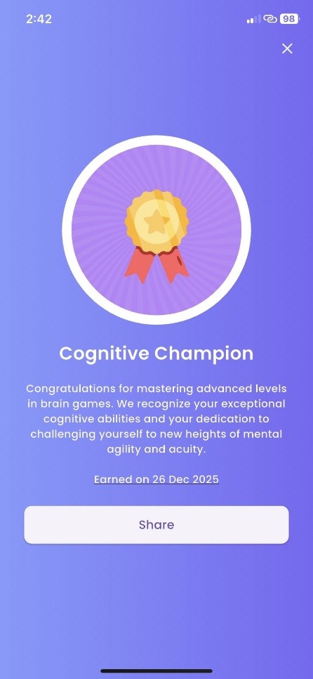 Find a minimum of 2 words out of 5 words in the Word Wizard game to earn the "Cognitive Champion" reward, rewarding your brain training and vocabulary skills.
