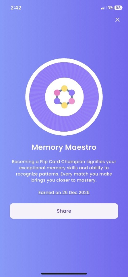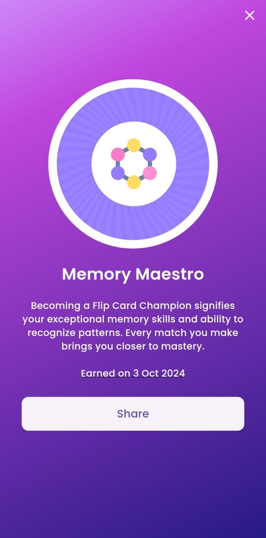 The "Memory Maestro" reward is awarded when a user wins the Flip Card game at the hard level, enhancing memory skills and concentration through challenging gameplay.