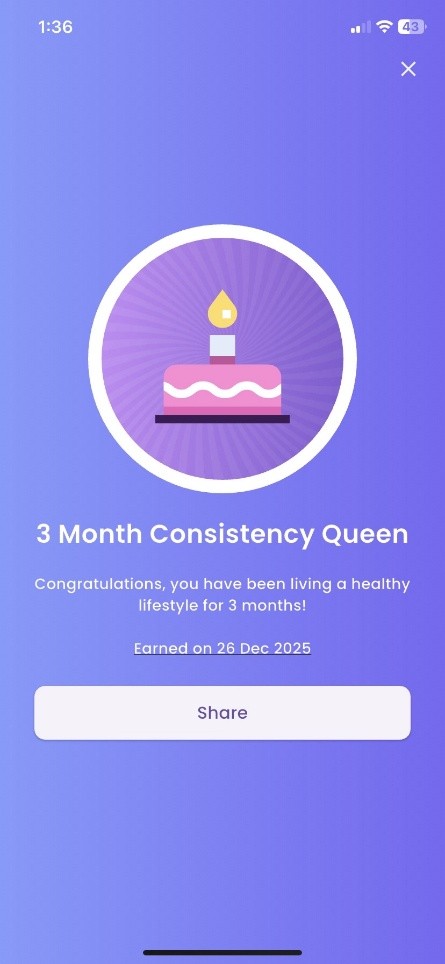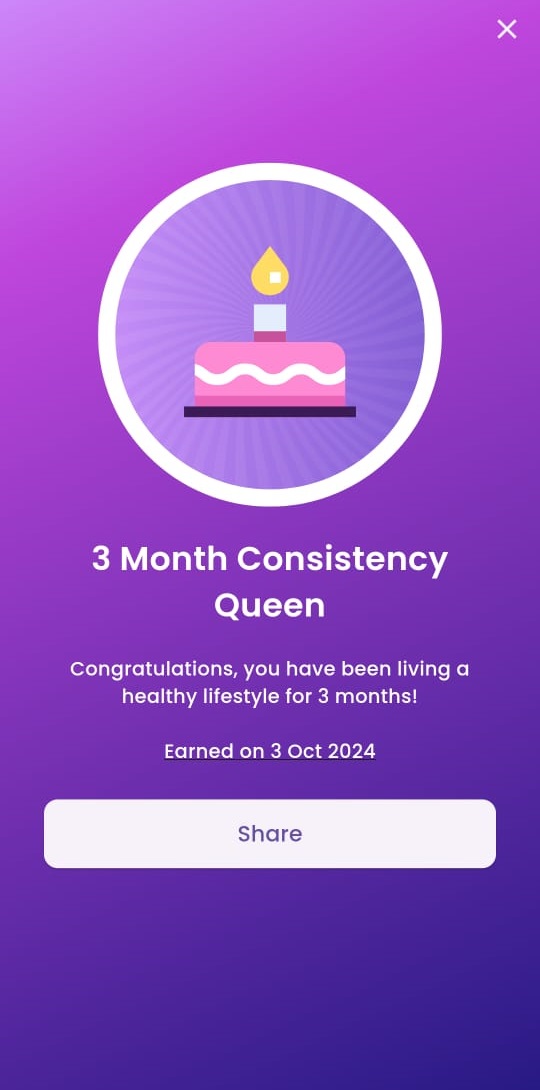 The "3 Month Consistency Queen" reward is awarded when a user completes workouts every day for three consecutive months, celebrating outstanding dedication and reinforcing a strong commitment to fitness.